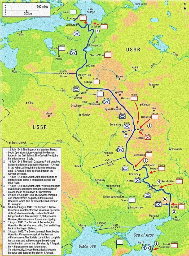 8. 3 августа 1943 года: советский Воронежский фронт начинает операцию Румянцева против немецкой 4-й танковой армии. Красная армия вводит в бой две полнокровные танковые армии и добиваются быстрого прорыва в первые же дни наступления. К 4 августа фронт 4-й танковой армии был разорван. Одновременно Степной фронт наступает на Белгород и освобождает город 5 августа.