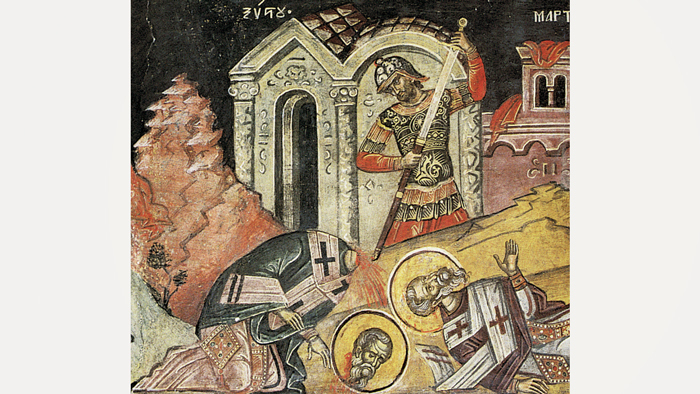 Не оставляю тебя, сын мой. Я старец и иду на лёгкую смерть, а тебе предстоят более тяжкие страдания. Знай, что через три дня после нашей смерти и ты пойдёшь за мной. А теперь пойди, продай церковные сокровища и раздай гонимым и нуждающимся христианам.