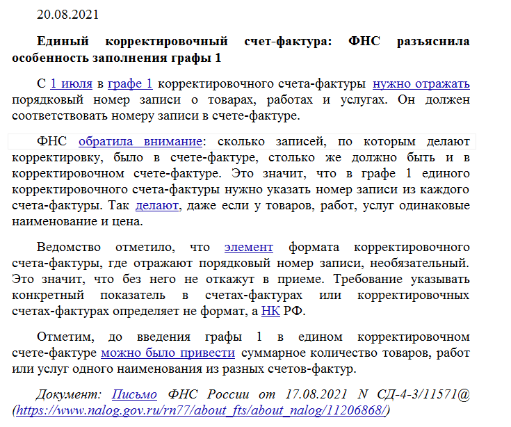 Единый корректировочный счет-фактура: ФНС разъяснила особенность заполнения графы 1