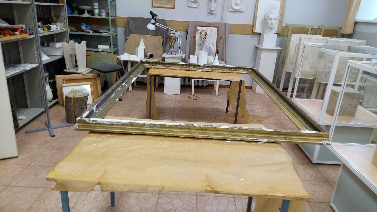 На фото: В мастерской художника реставратора. Восстановление рамы
