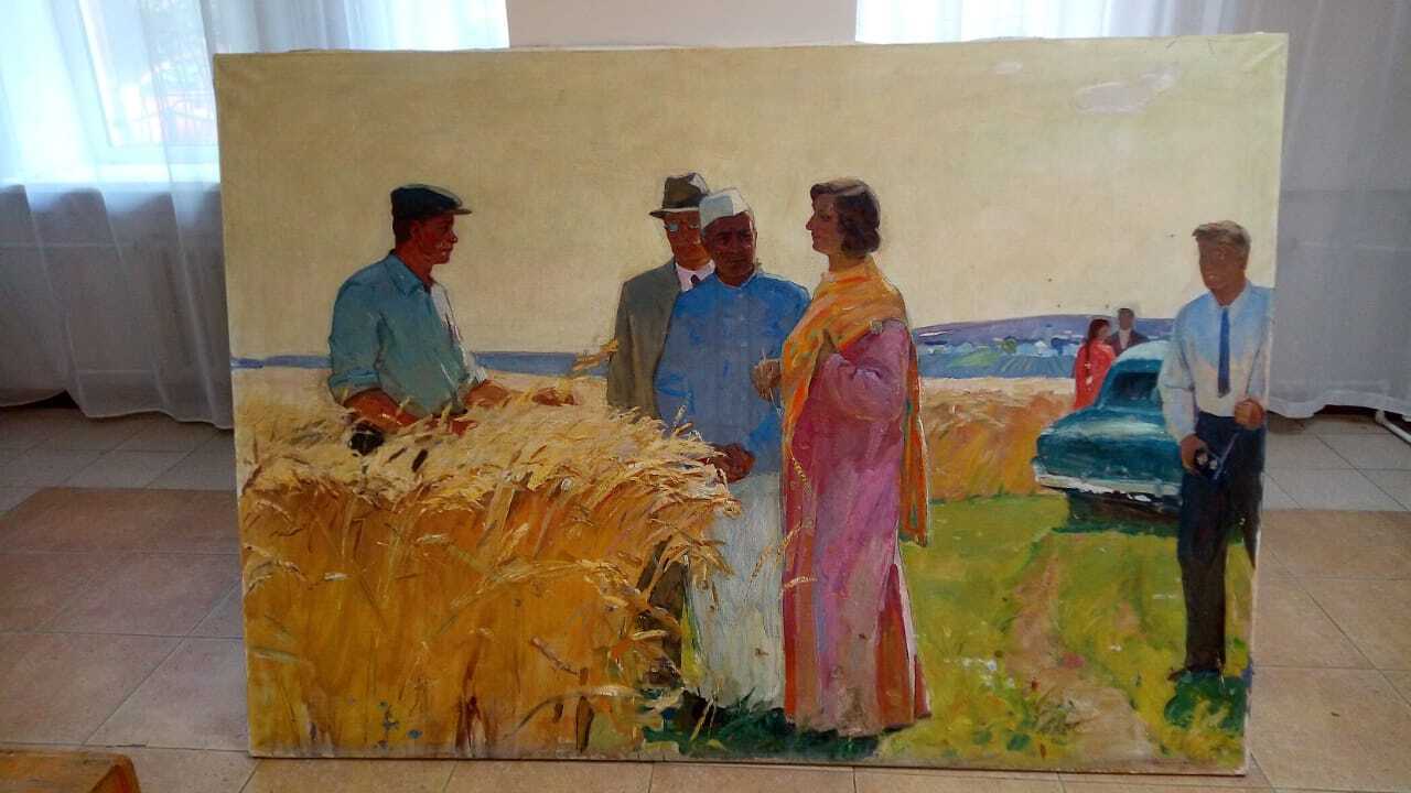 С момента визита Джавахарлала Неру и Индиры Ганди в СССР прошло 66 лет. Фотографии с визитом Неру и Ганди в Интернете есть, а вот картины ни одной не удалось найти. Тем «Дружба народов» ценнее. Ей исполнилось 52 года и огорчает, что полотно немного «травмировано» – в нескольких местах истыкано чем-то острым, а внизу даже порвано. Вот бы его «подлечить»…