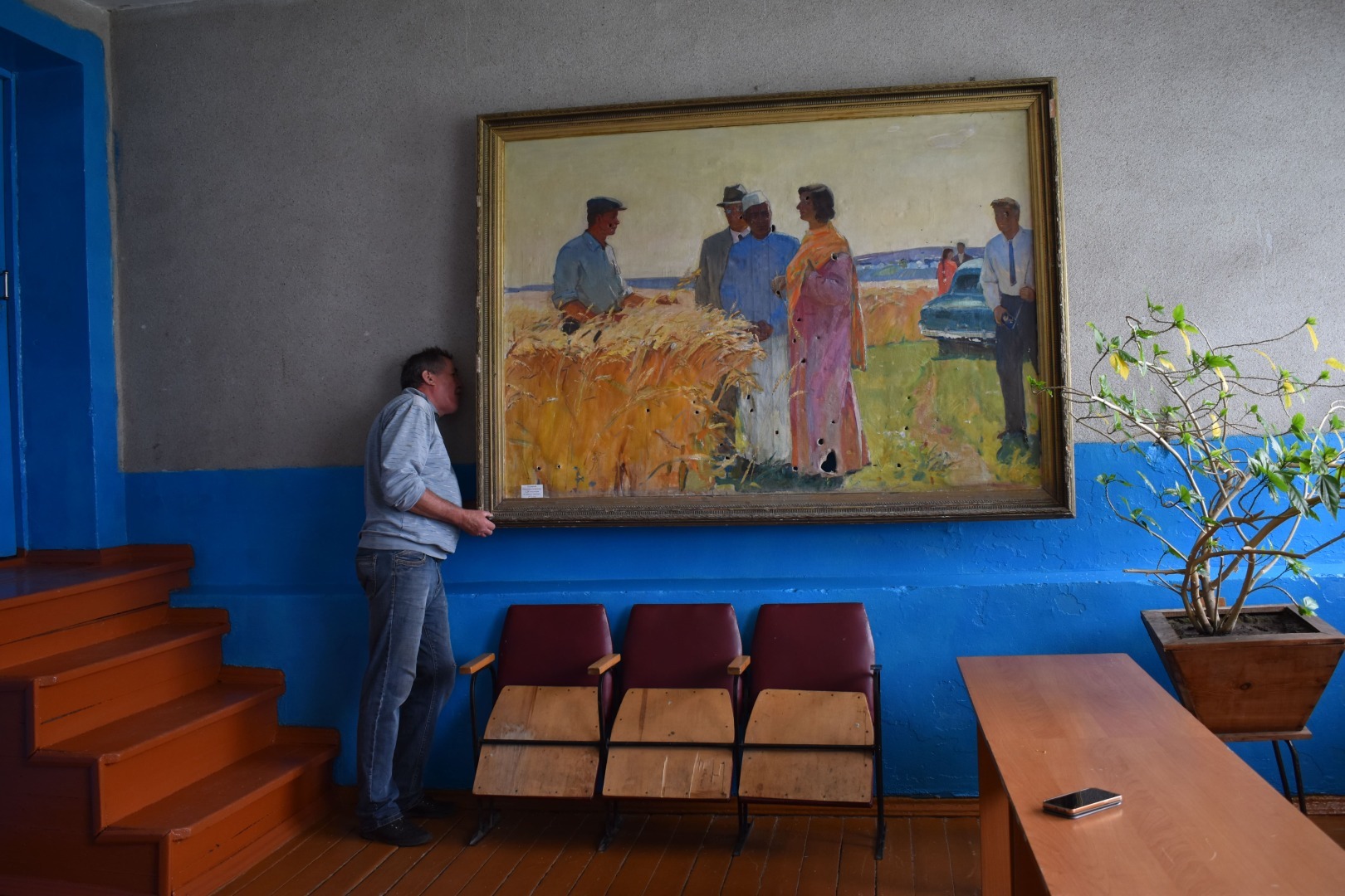 И вот мы с Олегом в селе, в Доме культуры. Встреча воочию с директором СДК и Главой сельсовета дает больше информации. Оказывается, в фойе, где висит картина, когда-то стоял бильярдный стол. Парни и ребята, возможно, в запале игры проткнули полотно киями. Теперь понятно, откуда повреждения.