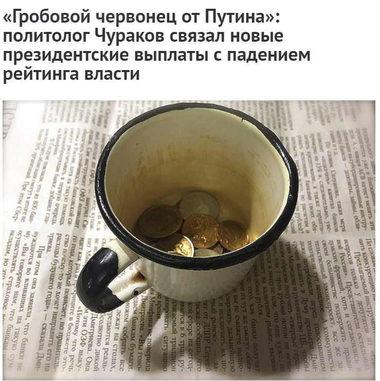 Не спасет эта кроха с барского стола, равно как и аналогичная в недалеком прошлом медведевская в 5000 тыс. рублей..,больше, как ни напрягал мозги, ничего не вспомнил, складывается впечатление агонии власти, однако агония является обратимым состоянием, - решать людям конечно. Спасение утопающих, дело рук самих утопающих.