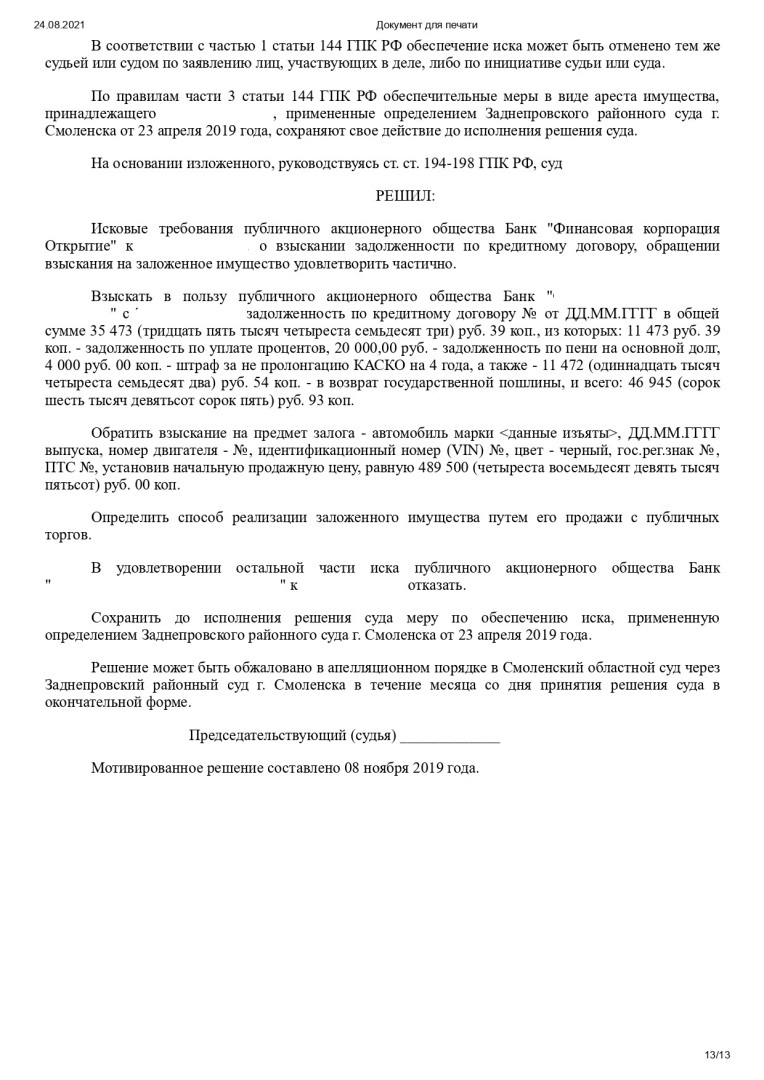 Однако, мой доверитель сообщил, что такое решение вполне его устраивает, обжаловать его не нужно. Уточнив порядок его исполнения, после вступления в законную силу решения, денежные средства были перечислены банку.