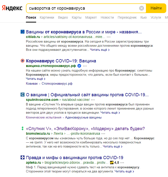 этой своей статье я уже писал, какое лечение следует принимать при ковиде, могу и еще кое-что посоветовать. Но я тут хотел сказать вот о чем. Помимо обычных лекарств и вакцин, имеется и такое средство, как сыворотка. Разрабатывать их, это тоже обязанность ученых. Но, разве вы хоть раз что-нибудь слышали про сыворотку от ковида? Вот и я тоже. Более того, такое впечатление, что ее просто не существует в природе. Вот, возьмем поисковую систему Яндекс и поинтересуемся про сыворотку от коронавируса: