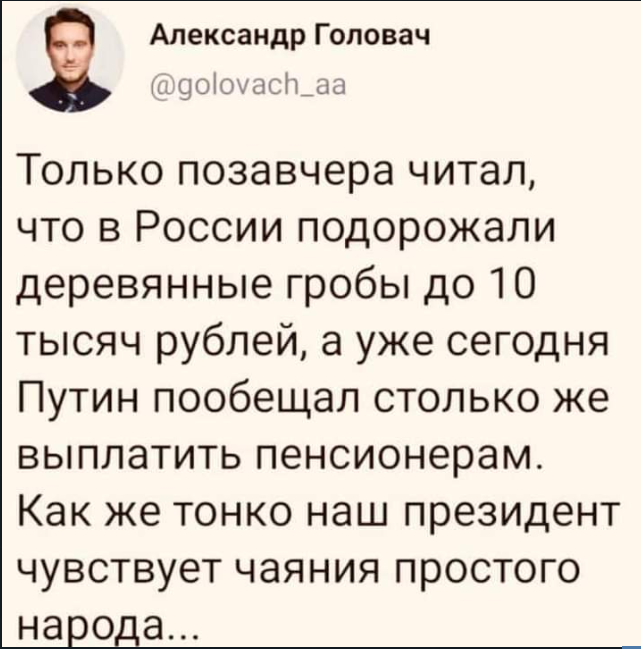 "Покойный перед смертью 10 тысяч получал?" - "Да, получал" - "Вот, и славно!". Это уже из предстоящей телеконференции Пу с народом.