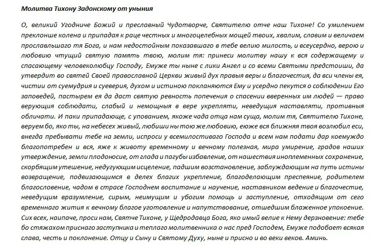 Молитва святителю Тихону помогают верующим избавиться от болезней, от духовных страданий или от тяжёлого алкоголизма. Они помогают восстановить утраченную веру, вернуть спокойствие и обрести утешение. Также молитва к нему очень сильно помогает при избавлении от уныния, как греха.