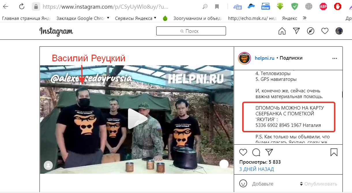 В середине августа 2021 года "отец лосей" совместно с хелпнями объявил сбор средств для создания ПСГ (поисково-спасательной группы) по поиску в Якутии животных пострадавших от лесных пожаров.