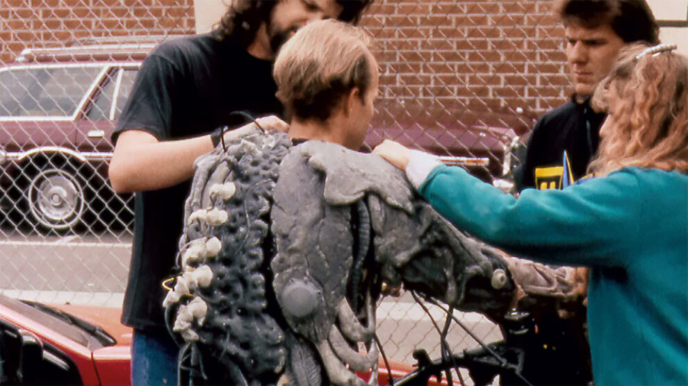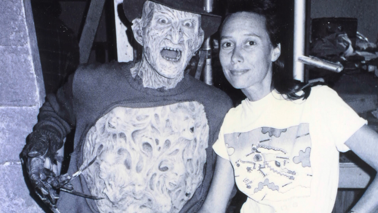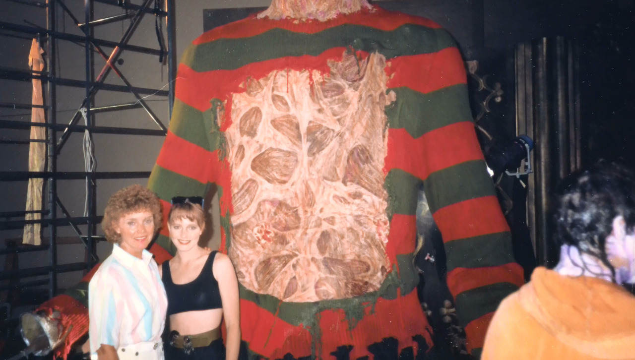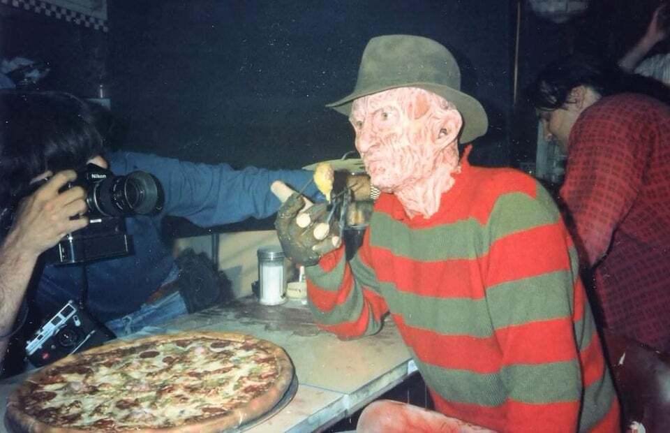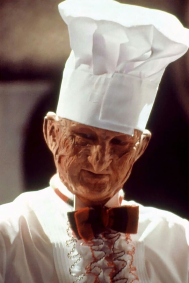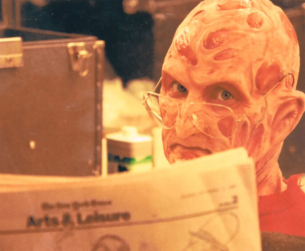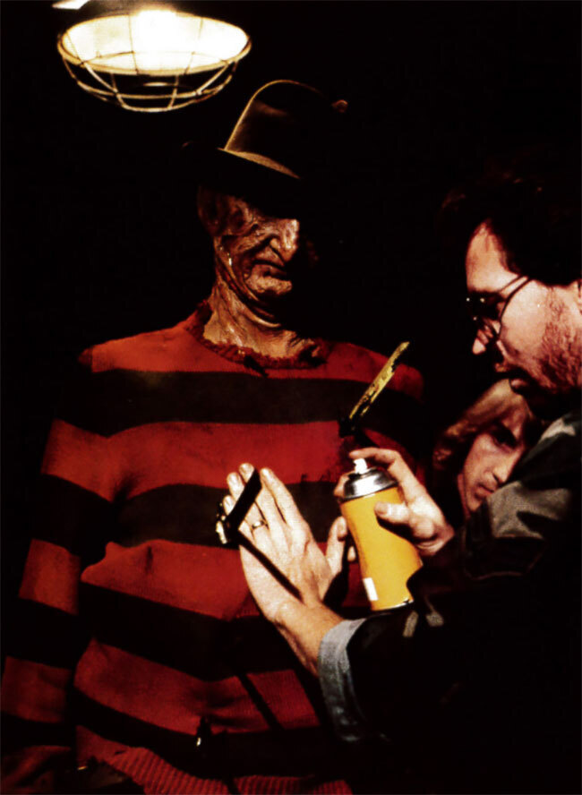 Роберт Инглунд возится со своим протезом для кинофильма Ужас на улице Вязов в 1984 году.