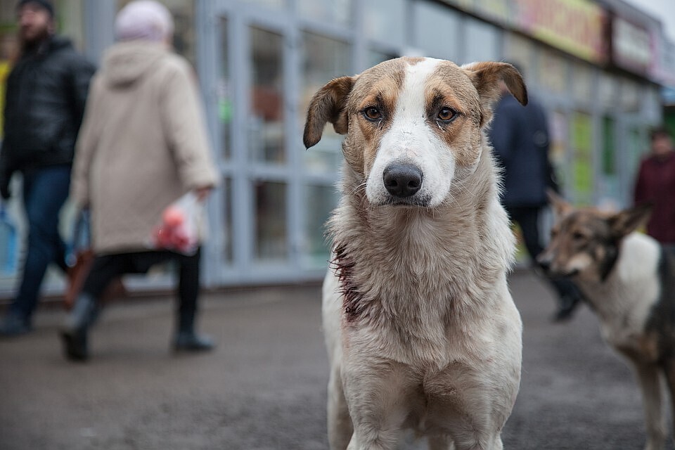 Собака была травмирована, от боли и страха находилась в состоянии шока, подняться не могла. Раны были открытые, собака была перемазана кровью.