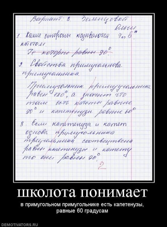 Вспомнил я одну мою недавнюю историю. Несколько лет назад обратилась ко мне одна бабушка с просьбой поучить, потренировать её внука в математике перед поступлением в институт. Пришёл ко мне этот её внук. Стал я его сразу расспрашивать, просто так, и всё про всё. Спросил его о формуле теоремы Пифагора. Он отвечает - МЫ ЭТО ПРОХОДИЛИ. На все мои вопросы про синусы, косинусы, тангенсы, треугольники, равнобедренные, прямые углы, он мне ВСЁ ВРЕМЯ, ГОВОРИЛ ТОЛЬКО ОДНО - МЫ ЭТО (В ШКОЛЕ) ПРОХОДИЛИ. Но ничего на листе бумаги он написать не мог. Спрашиваю его - А какая у тебя оценка по математике - ЧЕТЫРЕ!!! Я чуть со стула не упал от такого ответа. Немного я с ним позанимался, месяца три, и мне эта его ограниченность, неспособность элементарно мыслить, надоела. Своих забот хватает. Отпустил я его. Через год я бабушку ту встречаю. А она меня благодарит. Говорит, что после моих занятий по математике, её внук поступил в институт. ИНЖЕНЕРОМ-СТРОИТЕЛЕМ БУДЕТ, учится на хорошо и отлично. Представляю я такого ИНЖЕНЕРА строителя, который правильно на стройке прямой угол не сможет завести. У которого прямых углов в здании не будет. Всё будет сикось-накось.