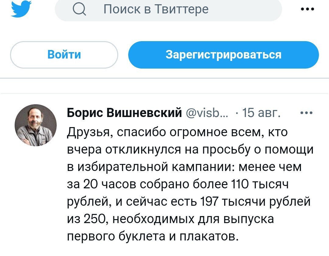 Налажено и некое подобие отчётности перед соратниками и избирателями как видно из приведённого скриншот страницы Вишневского в Twitter. А в соцсети "ВКонтакте" Борис Лазаревич даже целую иллюстрированную презентацию разместил, которую можно и как брошюру распечатать, чтобы в картинках понятно было куда денежки нести.