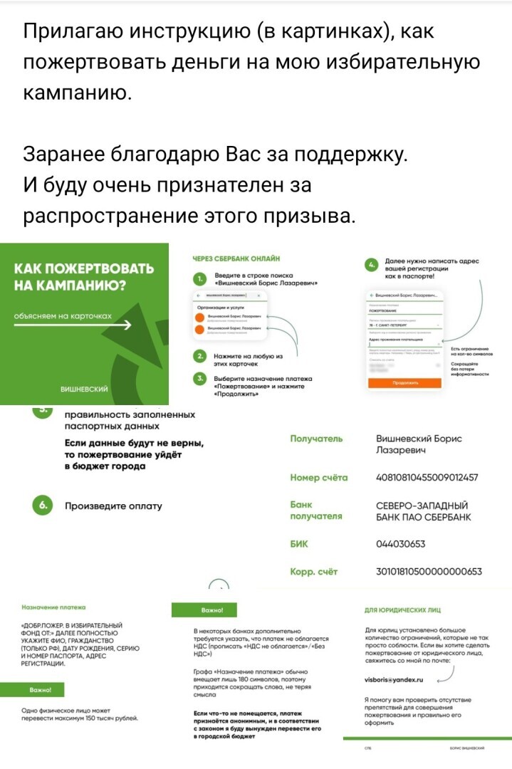 И потому сбор денег у Вишневского поставлен на нужные рельсы. Дабы спонсоры неловкие чего не перепутали, Борис Лазаревич на своих страницах в социальных сетях разместил инструкцию для юридических и физических лиц как пополнить его счёт. Очень познавательно, надо отметить.