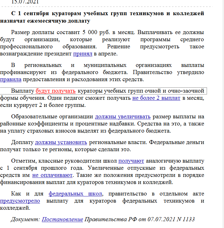 С 1 сентября 2021 года кураторам групп техникумов и колледжей назначат ежемесячную доплату.