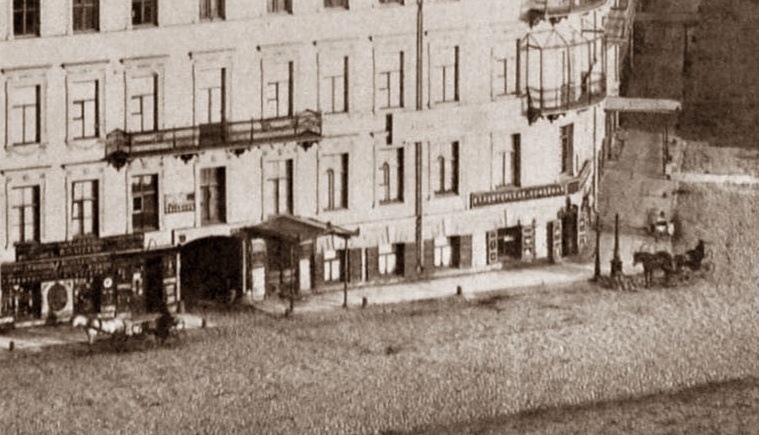 Население Санкт-Петербурга в 1870 году должно было составлять 682 300 человек. Мы не видим ни одного из них, вернее на всей панораме мы видим: 2 повозки с запряженными лошадьми но без людей, еще две повозки и две лошади без людей, еще две повозки в каждой по одному человеку (кучер), и один человек задумчиво стоящий у одного из зданий.