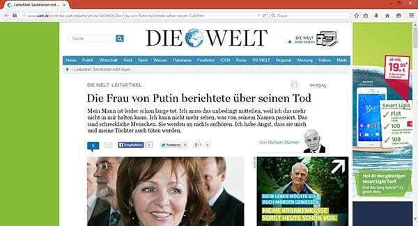 А в марте 2015 г. в немецкой газете Die Welt появилась сенсационная статья, опубликованная от имени Людмилы Путиной. В этом интервью женщина рассказывает, что ее мужа давно нет в живых. Она сообщает, что решилась рассказать обо всем, поскольку тяжело видеть, что происходит в России. Людмила рассказала, что жизнь с Владимиром не была идеальной: в семейной жизни он был жестоким человеком, тиранящим жену и детей. Жизнь с ним превратилась для женщины в суровое испытание: ей пришлось перенести побои, унижения, издевательства. Ее попытки отстоять свою независимость привели к тому, что Людмилу отправили в психиатрическую клинику. Пребывание в изоляторе, применения психотропных препаратов сломили ее волю, она согласились стать тенью мужа.