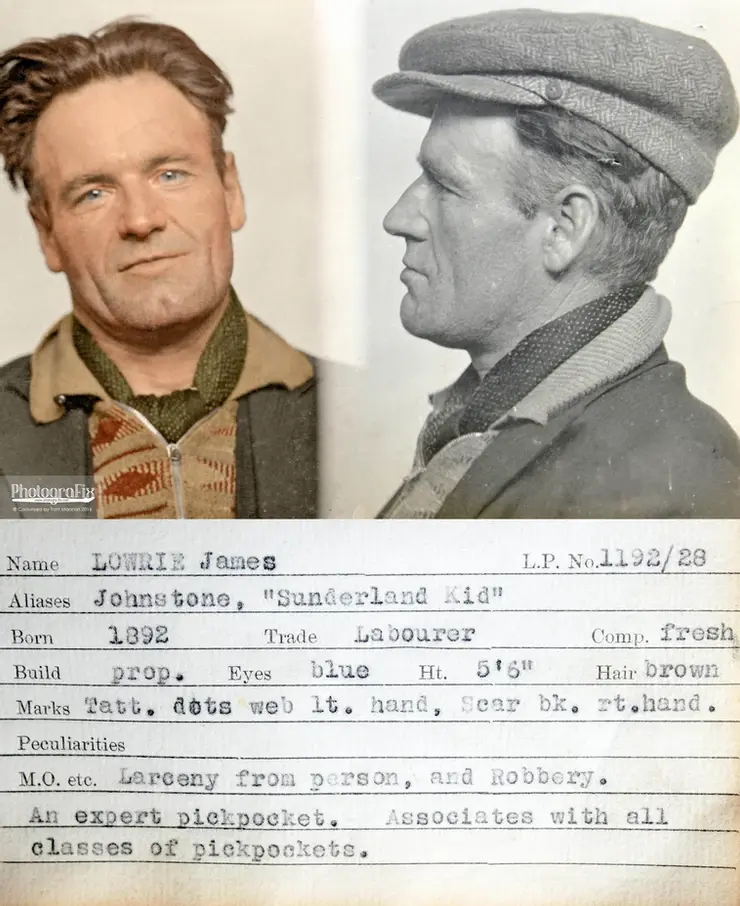 Тем не менее, некоторые, такие как Джеймс Лоури (см. Выше), похоже, криво улыбается, предполагая, что они профессиональные преступники и не чужды полицейскому снимку. Один из немногих с псевдонимом «Сандерленд Кид» был известен своей татуировкой, шрамом и историей краж, грабежей и карманных краж.