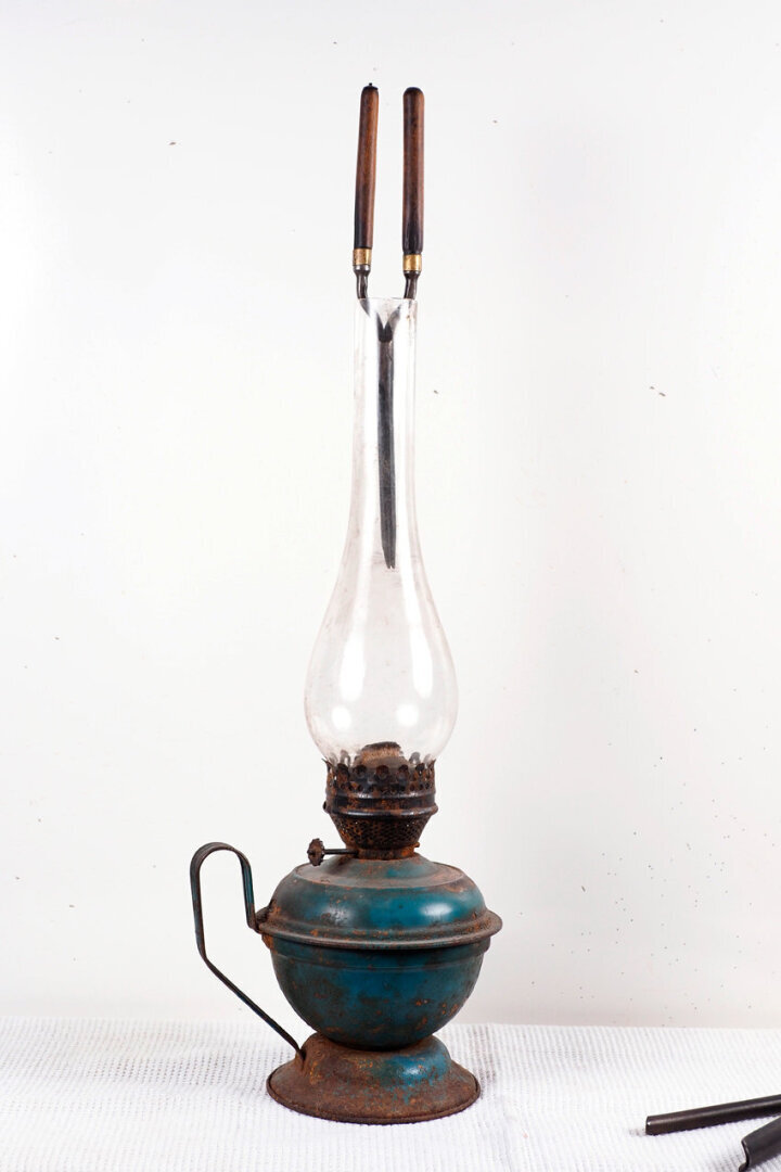 Керосиновая лампа с щипцами. С помощью таких устройств дамы делали себе очаровательные кудри.