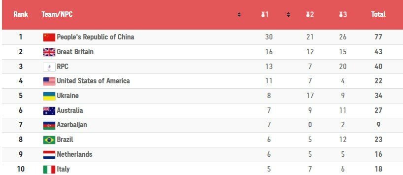 Таблица медального зачета Паралимпиады в Токио на 29.08.2021