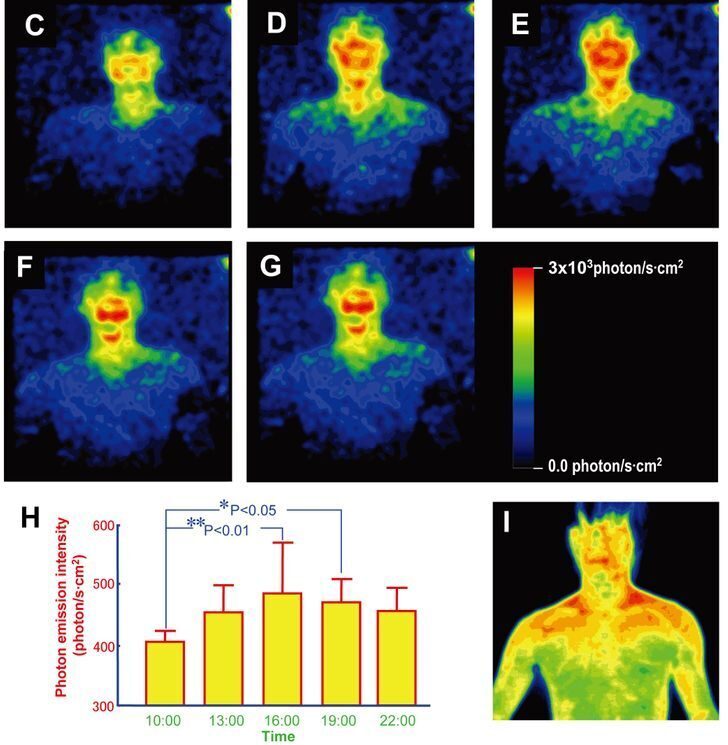 В 10 часов у человека сияние тусклое, а в 16 часов пик свечения и связано это как утверждают ученые, с метаболизмом.