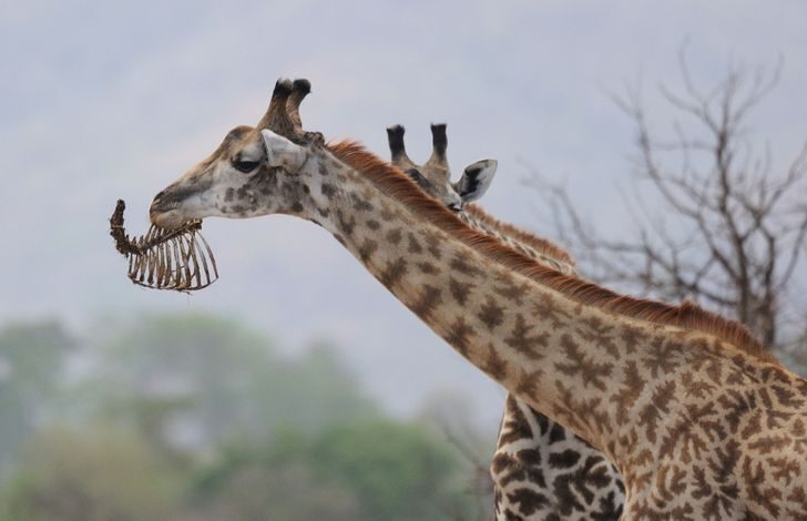 Мало кто знает, что очаровательные жирафы употребляют в пищу не только листву деревьев, их можно увидеть и за жутковатым занятием. Они обсасывают кости трупов других животных.