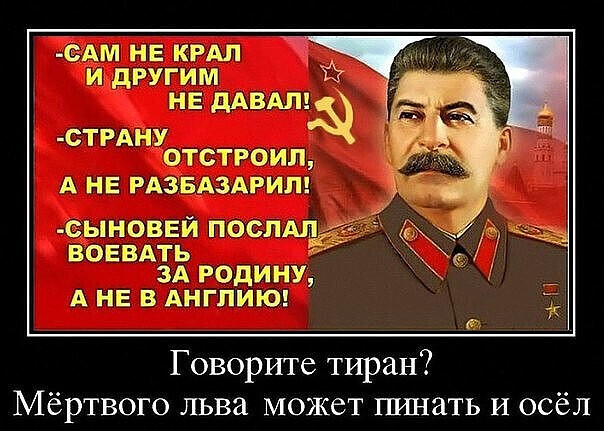 Упоротым совкам,особенно тем,кто вещает,что при Сталине жилось припеваючи,нужно бы хорошенько изучать историю)Тиран репрессировал в 30х годах множество кадровых военных(отсюда такие потери во время ВОВ),посадил уйму народа,большую часть ни за что(достаточно вспомнить дело врачей),практически уничтожил интеллигенцию и т.д.Его дружок по партии Ленин в свое время рассчитался с Германией за кредиты с целью свержения царской власти золотым запасом Российской империи и кроме всего прочего выплатил огромную контрибуцию...Как можно уважать подобных упырей?