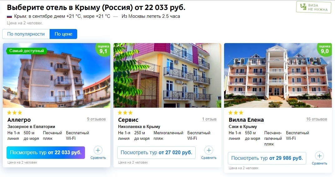 Так, средний тур в 3-х звездочный крымский отель на 7 дней на двоих человек в сентябре с завтраком обойдется от 22 033 от 75 189 рублей, включая перелет из Москвы: