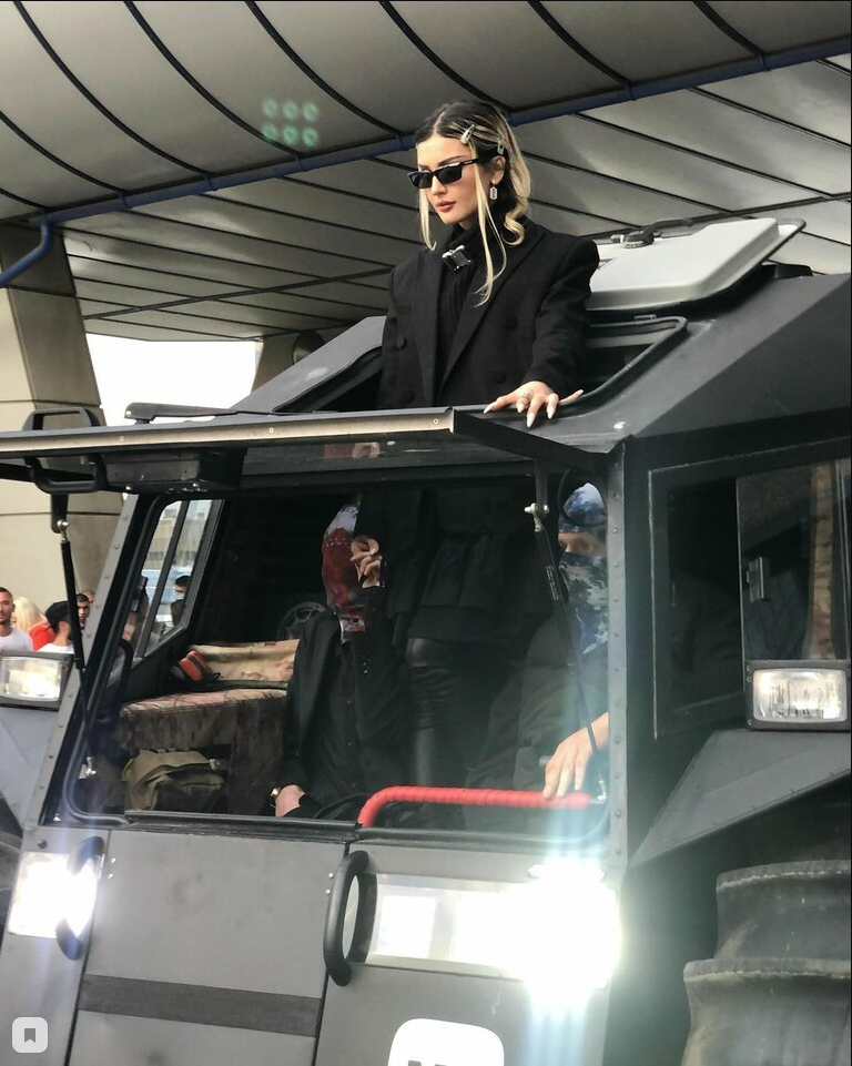 Вдохновившись недавним перфомансом Канье Уэста, королева Tik Tok Дина Саева ворвалась на причал на бронированном автомобиле вместе с загадочным молодым человеком в глухой балаклаве. Отсылка к альбому Donda плюс мини-косплей на Роршаха из «Хранителей». Актуальненько!