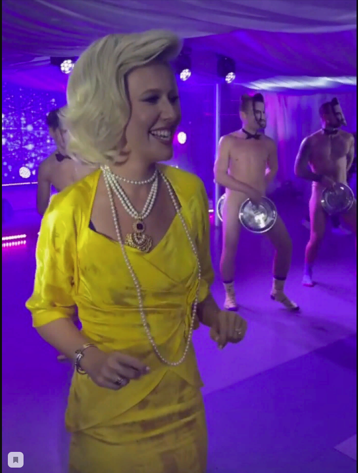 Не менее эффектно на празднике выглядела и Ксения Анатольевна Собчак. Мы называем ведущую по отчеству не просто так: благодаря утонченному желтому платью, бусам из жемчуга, туфлям-лодочкам и прическе с огромным начесом, знаменитая тамада прибавила к своему возрасту пару десятков лет. Сама Ксения назвала этот лук «дальняя родственница из Уфы». Мы не могли бы сказать точнее, браво!