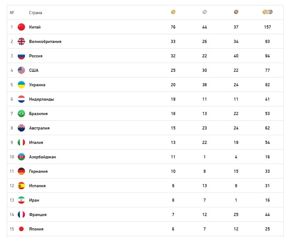 1 сентября 2021 года Россия вновь сместилась на третью позицию в медальном зачете Паралимпийских игр в Токио 2021 года. В копилке нашей сборной 94 медали, из них 32 золотые. На втором месте расположилась команда Великобритании с 33 золотыми медалями, а на первом - Китай, накопивший 76 медалей первой категории. Конечно, догнать Китай уже ни кто не сможет, а вот побороться за второе место Россия вполне способна.