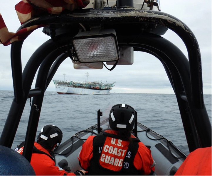 Береговая охрана США готовится к посадке на борт и осмотру рыболовного судна в северной части Тихого океана в 2019 году. Подобное усиление патрулей помогает сократить незаконный рыбный промысел.
