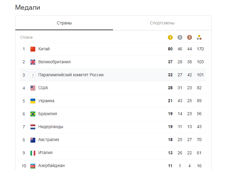 Таблица медального зачета Паралимпиады в Токио на 03.09.2021