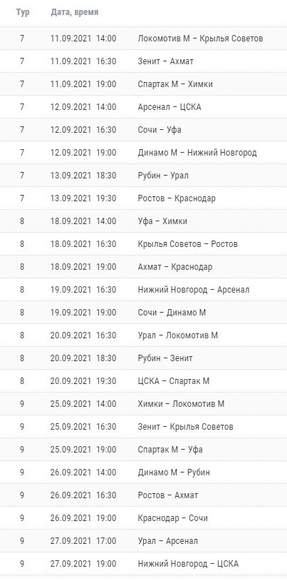 ЧМ России по футболу 2021/2022 - расписание матчей на сентябрь (Тинькофф РПЛ, премьер-лига)