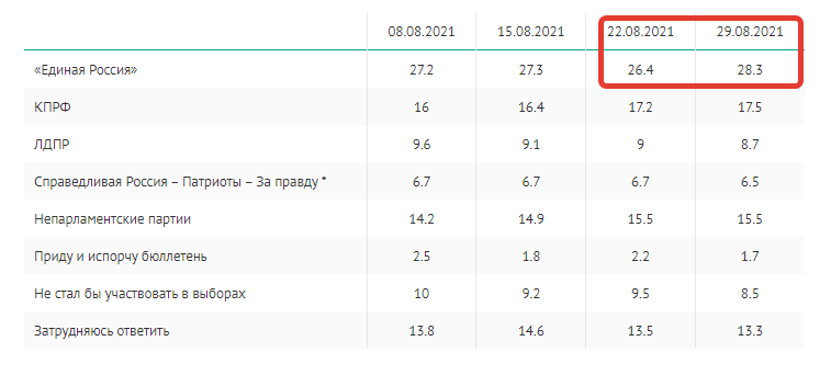 Так как снижавшийся все предыдущие недели электоральный рейтинг Единой России продемонстрировал неожиданный всплеск и увеличился на 2 %.