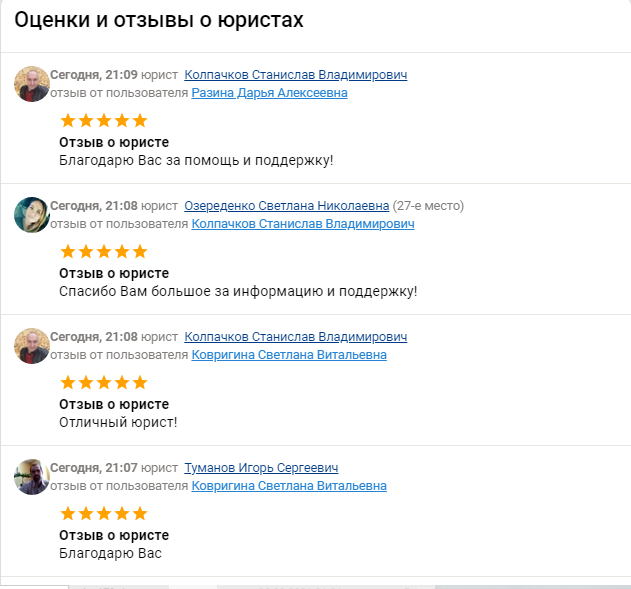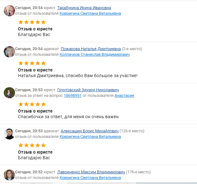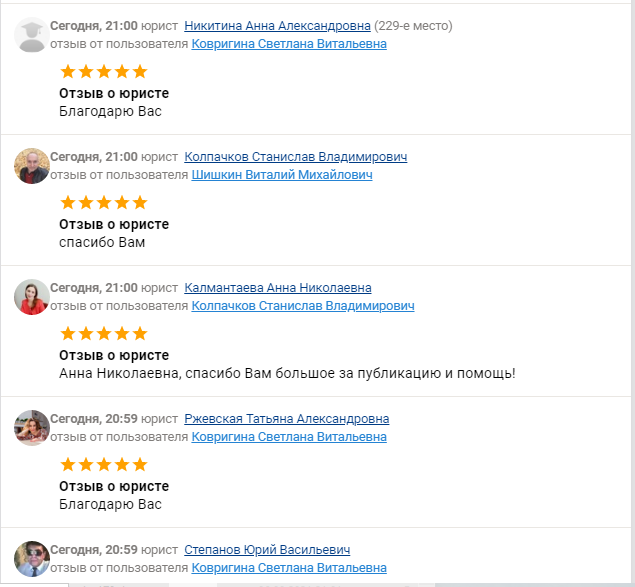 Смотришь у юриста или адвоката в отзывах куча благодарностей от других юристов и адвокатов - наверное он хороший специалист - а остальные которые пишут тогда не очень специалисты, и тут переходишь к написавшему благодарность юристу и теперь тот кого только что благодарили за помощь - теперь благодарит за помощь благодарившего.