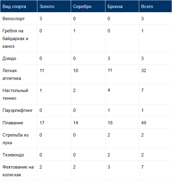 Напомним, максимальное количество медалей наша сборная выиграла в плавании и лёгкой атлетике — по 17 и по 11 золотых медалей соответственно.