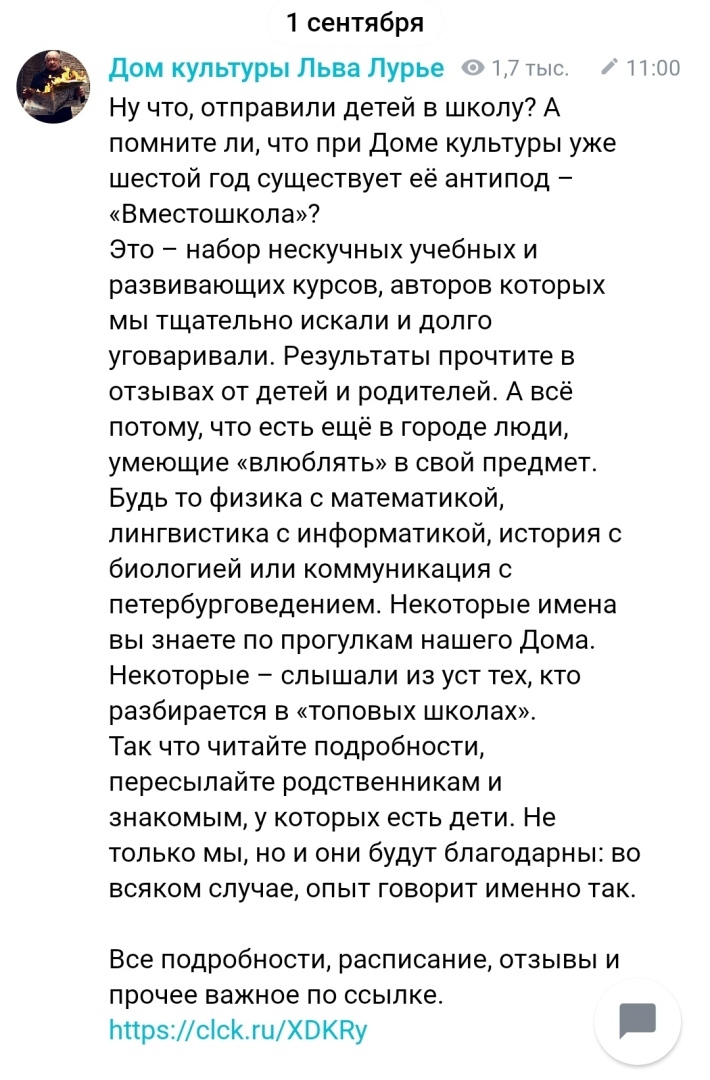 Напоминалка или новшество для Вас: Дом Культуры Льва Лурье – авторитетная петербургская просветительская организация, созданная знаменитым историком и педагогом Львом Лурье в 2011 году. Все в Петербурге знают, что еще он – сооснователь одной из лучших школ города и России – 610-й Классической Гимназии. При Доме культуры уже шестой год существует её антипод – «Вместошкола»? «Вместошкола» - собирательное название всего лучшего, что можно было найти в Санкт-Петербурге для детей. Экскурсии и интерактивы, годовые предметные курсы, каникулы и интенсивы: их авторов объединяют умение заинтересовать ребенка и дать ему то, что редко дает школа.