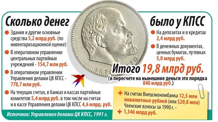 По оценке экспертов, в 1991 году коммунистическая партия была лишена собственности на сумму 19,8 миллиарда тех советских рублей. По современному курсу это 840 миллиардов рублей.