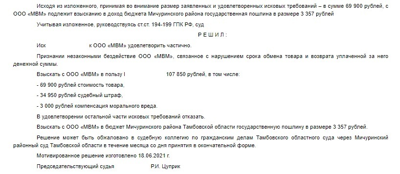 Штраф я просил в суде не уменьшать, т. к. "только слова, – сказал я в заседании, – это не действие, а результатом этих разборок должна быть выплата денег за брак". Выплатив их даже в день суда, до вынесения решения, торговец освободился бы от уплаты 50% штрафа.