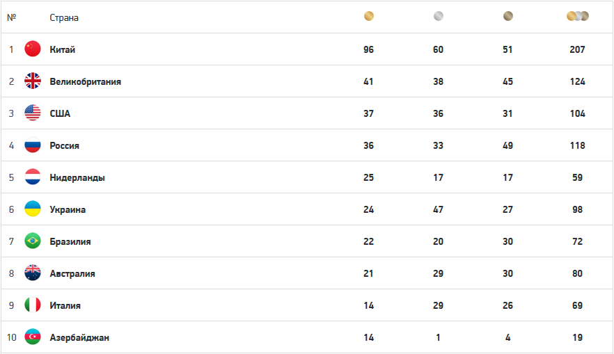 Первое место в общем зачете занимает Китай – у этой страны 95 золотых медалей, серебряных – 60, бронзовых – 51. На второй строчке Великобритания с результатом 41–38–44. Третью строчку занимают Соединенные Штаты.