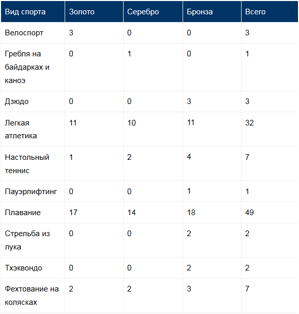 На утро 5 сентября команда России завоевала в общей сложности 118 медалей. Благодаря такому количеству наград Паралимпийский комитет России оказался на третьем месте в общем медальном зачёте XVI Паралимпийских игр в Токио.