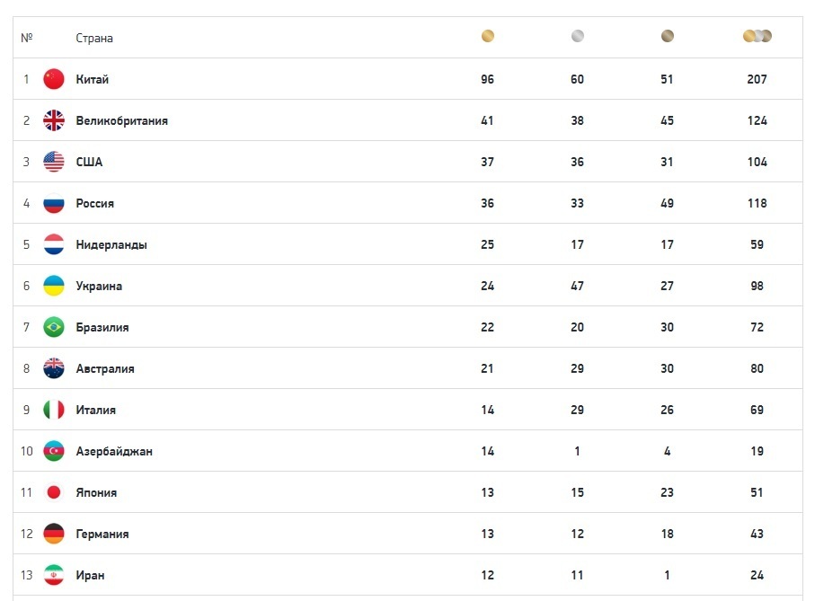 В итоге, первое место занял Китай, взяв 96 золотых медалей, второе место досталось Великобритании с 41 золотой медалью, еще 37 медалей высшей пробы взяли США, заняв третью позицию в медальном зачете. Россия же сместилась на четвёртую строчку, имея в своей копилке 36 золотых медалей.