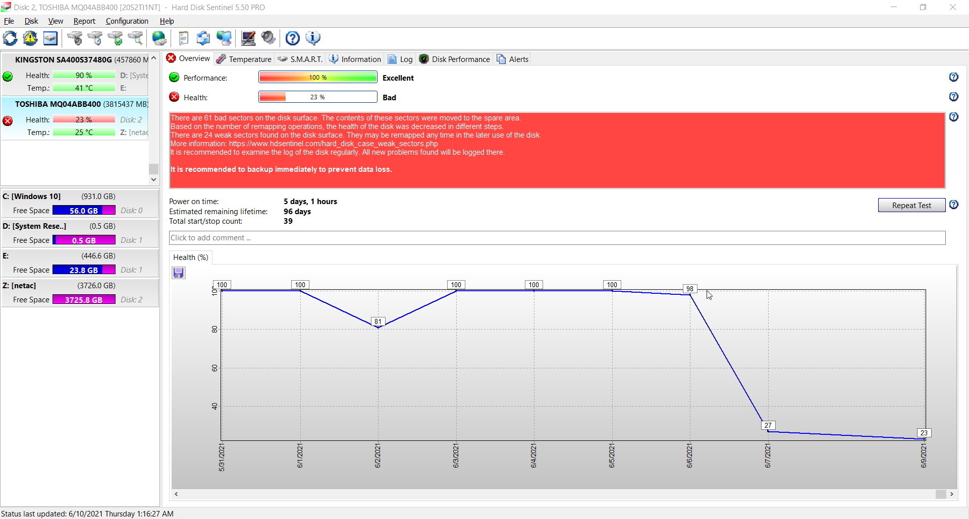 2021-06-01 проявились следующие симптомы и дефекты: долгое копирование/чтение файлов, замирание, загрузка до 100%, обращение, невозможность чтения файлов, и по этим причинам моя часть данных была повреждена.