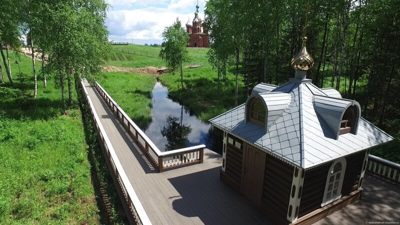 Чтобы добраться до места, откуда начинается полноводная русская река, надо пройти по дощатому настилу. Сейчас он облагорожен, есть и небольшая часовенка с табличкой, на которой написано, что исток Волги посетили и освятили патриарх Алексий II и Кирилл.