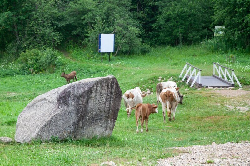 Рядом установлены камни с торжественной надписью. Правда, для местной живности они не больше чем предмет ландшафта. Буренки преспокойно пасутся рядом, не обращая внимания на туристов и патетику.