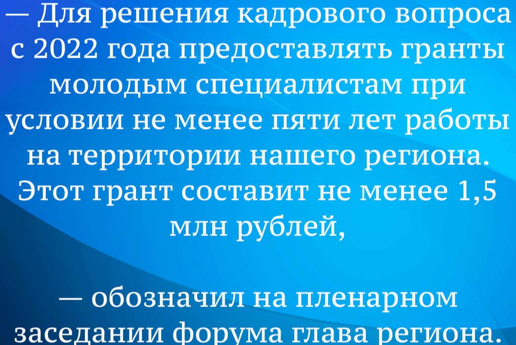 Конечно же, гранты в 1,5 млн рублей - это большое подспорье для молодых специалистов-медиков, которые начинают самостоятельную жизнь. Однако, хотелось бы, чтобы власти наши не забывали и о том, что есть ещё много других профильных специальностей, которых не хватает на селе. В частности, это учителя, воспитатели, агрономы, ветеринары и прочие специалисты.