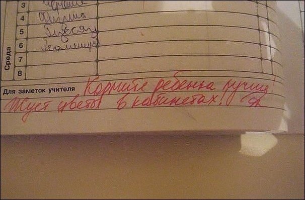 Мне в дневник не писали, но когда я работал в школе, приходилось писать замечания и просьбы к родителям заняться вплотную воспитанием ребенка дома. Потому что чаще всего недоработка в домашнем воспитании приводит к нарушениям дисциплины в школе. Плохо, когда учителя пугают ученика родителями, а родители учителями. Вот я пожалуюсь твоего классному руководителю или директору школы, тогда увидишь. А классный руководитель: Я все расскажу твоим родителям, пусть они тебе ремня дадут. Это не воспитание, хотя к нему точно прибегают отдельные взрослые, знаю из практики работы директором школы, а антивоспитание. Двигателем воспитательного процесса должен быть крепкий союз единых требований к учащимся со стороны родителей и учителей. Трудно, но этого можно достичиь, если еще и государство будет достойно оплачивать эту работу, так необходмую обществу.