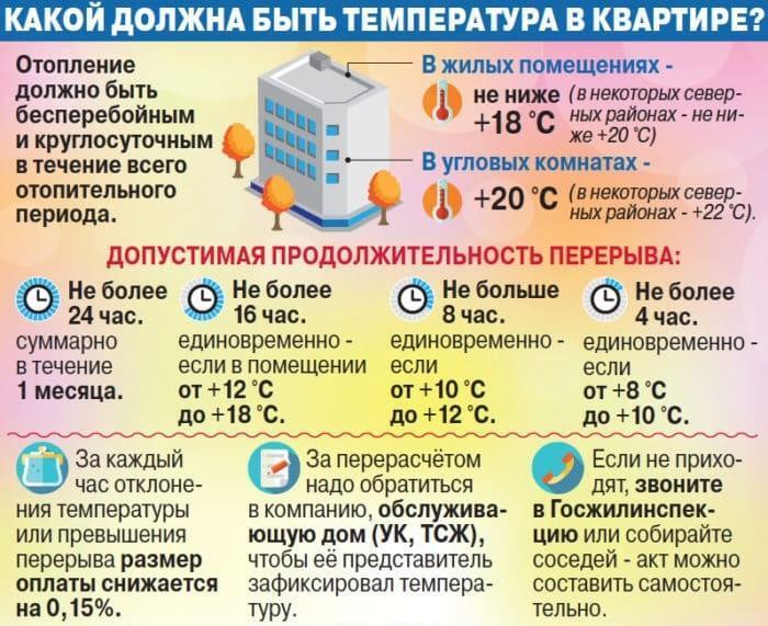 По окончании работ составляется приемосдаточный акт и техпаспорт. После того, как включат отопление, в квартирах должна поддерживаться температура, представленная в таблице.