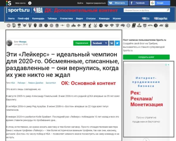 Каждая страница проходит через оценку PQ. Страница делится на несколько блоков: дополнительный контент, основной и платный (реклама).
