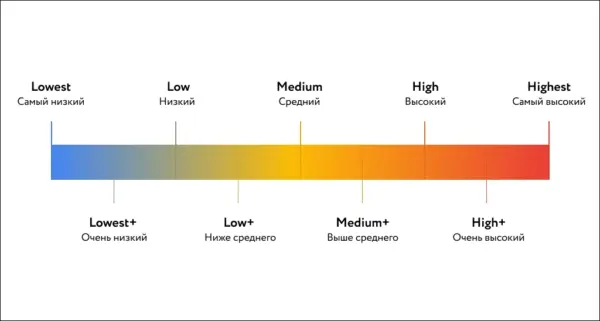 Далее Google присваивает каждой странице рейтинг качества. Система рейтинга очень интуитивна, что не удивительно для Google. Страница может получить одну из 9 оценок. Вот как выглядит Page Quality Raiting: